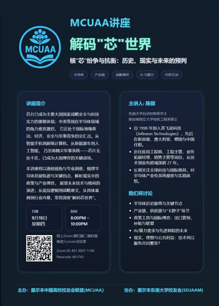 9月18日晚8点,由墨尔本中国高校校友会联盟(MCUAA)主办、墨尔本东南大学校友会协办的专题讲座——“解码芯世界”顺利举行。本次讲座特邀半导体行业资深从业者陈骐先生主讲,聚焦全球半导体产业的技术演进与地缘格局,为与会者呈现了一场内容丰富、分析透彻的精彩分享。